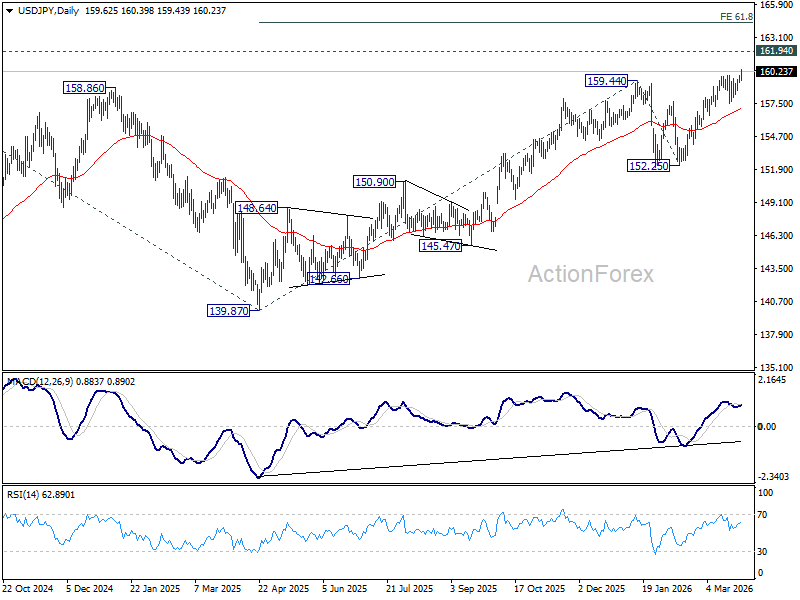 USD/JPY’s rally from 152.25 resumed by breaking through 159.88 resistance last week. Initial bias remains on the upside and further rise should be seen to retest 161.94 high next. On the downside, below 159.35 minor support will turn intraday bias neutral first. But near term outlook will stay bullish as long as 157.49 support holds, in case of retreat.