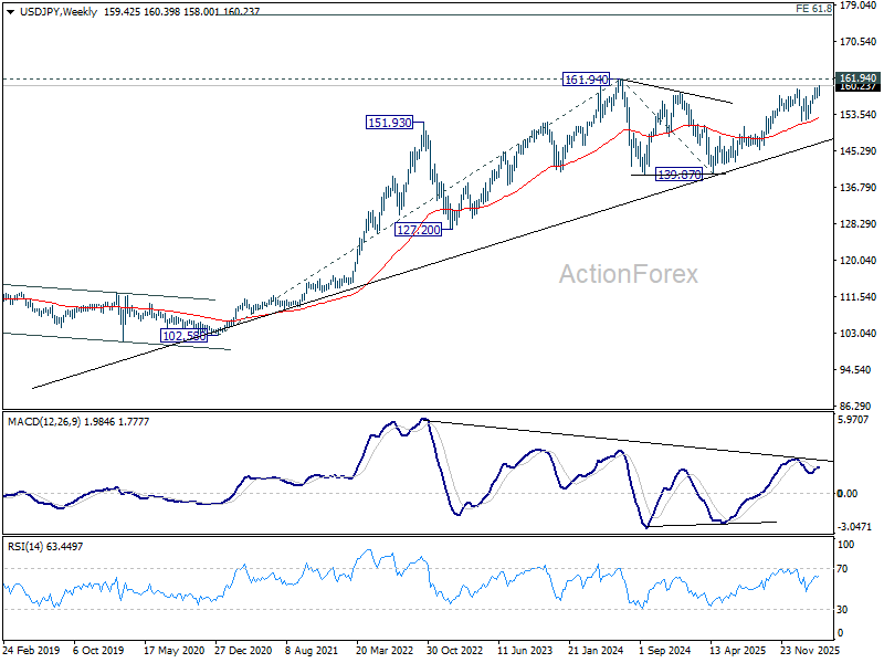In the bigger picture, outlook is unchanged that corrective pattern from 161.94 (2024 high) should have completed with three waves at 139.87. Larger up trend from 102.58 (2021 low) could be ready to resume through 161.94. This will remain the favored case as long as 55 W EMA (now at 152.97) holds. Firm break of 161.94 will pave the way to 61.8% projection of 102.58 to 161.94 from 139.87 at 176.75.