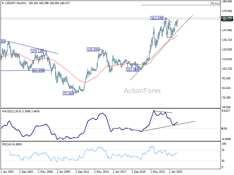 In the long term picture, up trend from 75.56 (2011 low) is still in progress and might be ready to resume. Firm break of 161.94 will target 61.8% projection of 102.58 (2020 low) to 161.94 (2024 high) from 139.87 at 176.55 in the medium term. Long term outlook will stay bullish as long as 139.87 support holds, even in case of deep pullback.
