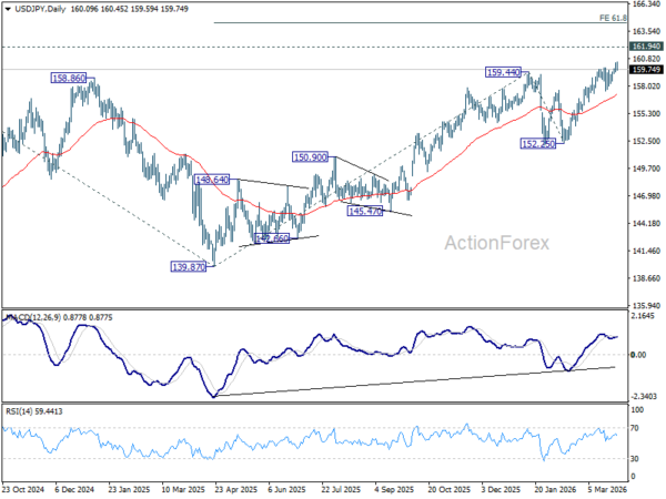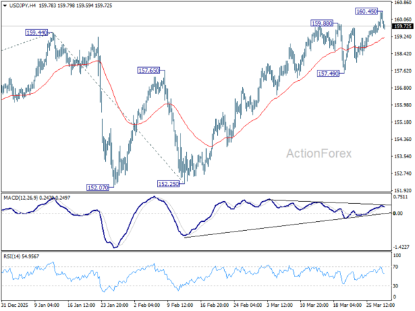 Intraday bias in USD/JPY is turned neutral with current retreat. Some consolidations would be seen but further rally is still in favor. Above 160.45 will bring retest of 161.94 high. Nevertheless, considering bearish divergence condition in 4H MACD, sustained break of 55 4H EMA will indicate short term topping, and turn bias to the downside for 157.94 support instead.