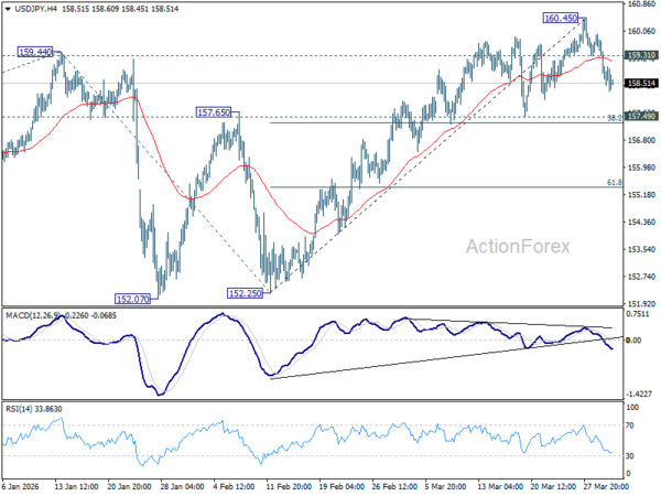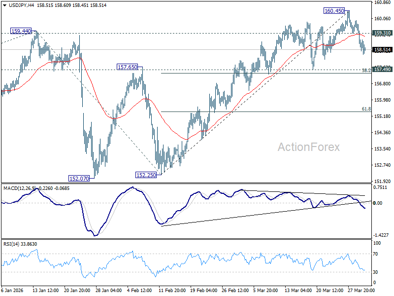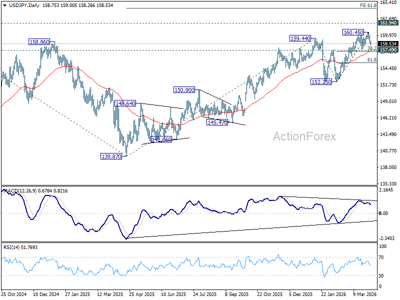Intraday bias in USD/JPY stays mildly on the upside for the moment. Fall from 160.45 short term top should extend to 157.49 cluster support (38.2% retracement of 152.25 to 160.45 at 157.31. On the upside, above 159.31 minor resistance will turn intraday bias neutral. But near term outlook will stay neutral as long as 160.45 resistance holds, in case of recovery.