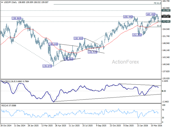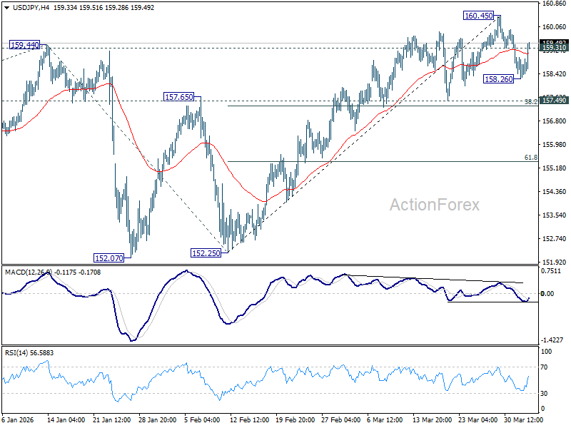 Intraday bias in USD/JPY is turned neutral first with break of 159.31 minor resistance. Consolidations from 160.45 could extend further with another falling leg. But overall outlook will remain bullish as long as 157.49 cluster support (38.2% retracement of 152.25 to 160.45 at 157.31) holds. Firm break of 160.45 will resume the rise from 152.25 to retest 161.94 high.