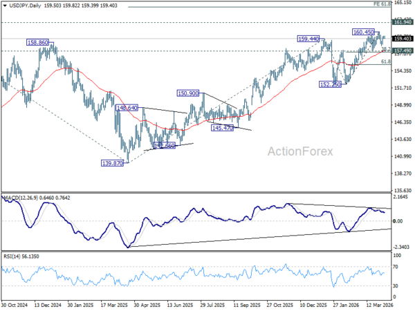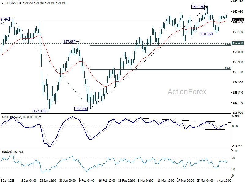 USD/JPY is extending consolidations below 160.45 and intraday bias remains neutral. Another fall could be seen, but overall outlook will remain bullish as long as 157.49 cluster support (38.2% retracement of 152.25 to 160.45 at 157.31) holds. Firm break of 160.45 will resume the rise from 152.25 to retest 161.94 high.