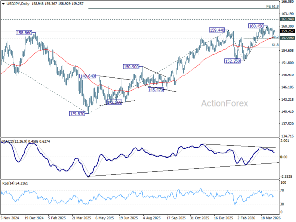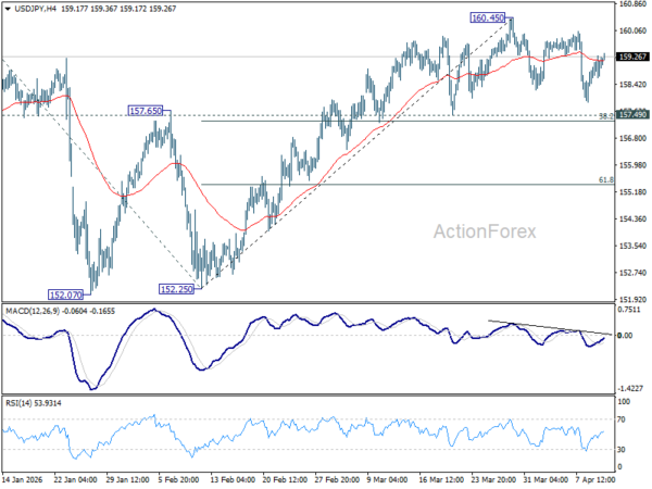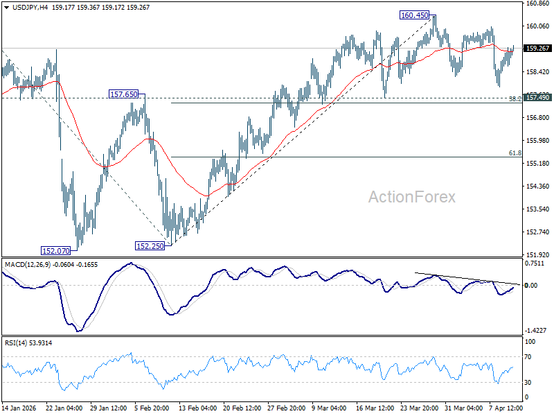 USD/JPY is still extending consolidations below 160.45 and intraday bias stays neutral. Further rise is expected as long as 157.49 cluster support (38.2% retracement of 152.25 to 160.45 at 157.31) holds. Firm break of 160.45 will resume the rise from 152.25 to retest 161.94 high. However, firm break of 157.31/49 will bring deeper fall back to 61.8% retracement at 155.38 next.