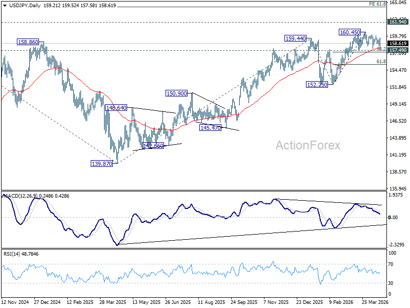 USD/JPY experienced some high volatility last week but after all, it’s still bounded in range trading below 160.45. Initial bias stays neutral this week first. Further rise is expected with 157.49 cluster support (38.2% retracement of 152.25 to 160.45 at 157.31) intact. On the upside break of 160.45 will target a retest on 161.94 high. However, firm break of 157.31/49 will bring deeper fall back to 61.8% retracement at 155.38 next.