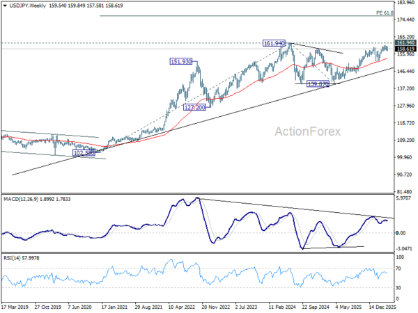 In the bigger picture, outlook is unchanged that corrective pattern from 161.94 (2024 high) should have completed with three waves at 139.87. Larger up trend from 102.58 (2021 low) could be ready to resume through 161.94. This will remain the favored case as long as 55 W EMA (now at 153.61) holds. Firm break of 161.94 will pave the way to 61.8% projection of 102.58 to 161.94 from 139.87 at 176.75.