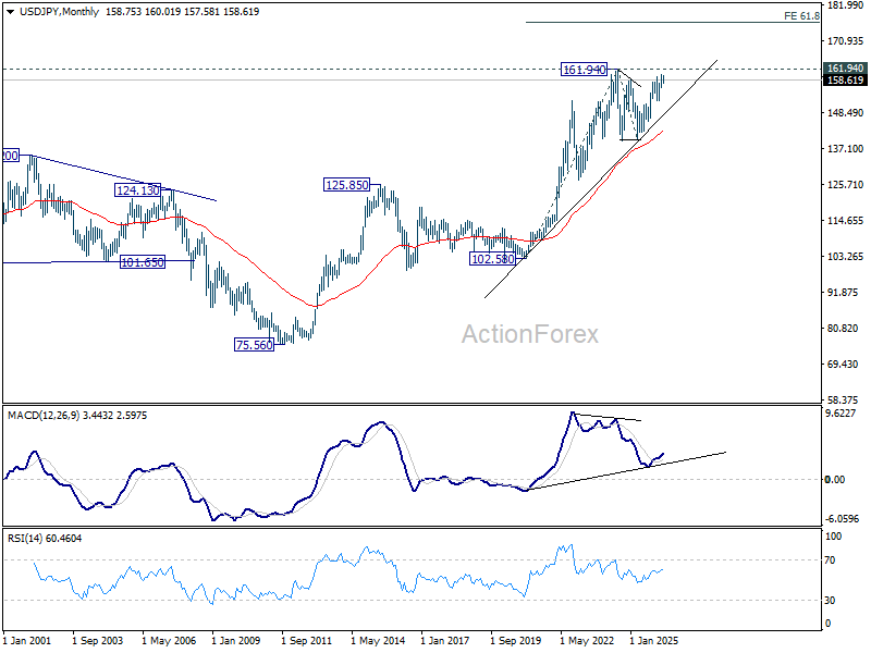 In the long term picture, up trend from 75.56 (2011 low) is still in progress and might be ready to resume. Firm break of 161.94 will target 61.8% projection of 102.58 (2020 low) to 161.94 (2024 high) from 139.87 at 176.55 in the medium term. Long term outlook will stay bullish as long as 139.87 support holds, even in case of deep pullback.