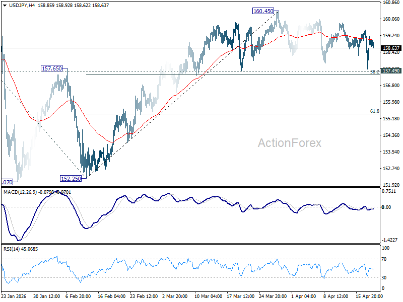 Intraday bias in USD/JPY remains neutral at this point, as consolidations continue below 160.45 short term top. Further rise is expected with 157.49 cluster support (38.2% retracement of 152.25 to 160.45 at 157.31) intact. On the upside break of 160.45 will target a retest on 161.94 high. However, firm break of 157.31/49 will bring deeper fall back to 61.8% retracement at 155.38 next.