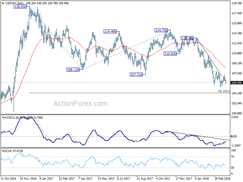 In the bigger picture, current development argues that the corrective pattern from 118.65 is extending. The solid break of 61.8% retracement of 98.97 to 118.65 at 106.48 now suggests that the pattern from 125.85 high is possibly extending. Deeper fall could be seen through 98.97 key support (2016 low). This bearish case will now be favored as long as 110.47 resistance holds.