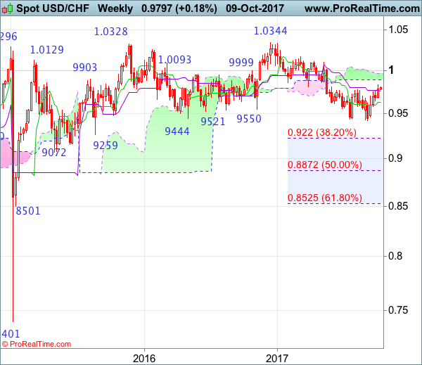 On the weekly chart, the greenback surged again last week and broke above previous resistance at 0.9773, adding credence to our view that low has been formed earlier at 0.9421, hence consolidation with mild upside bias is seen for the rebound from 0.9421 to bring retracement of recent decline to 0.9845-50 (61.8% Fibonacci retracement of 1.0108-0.9421), then test of the lower Kumo (now at 0.9894) but upside should be limited to the upper Kumo (now at 0.9970), price should falter well below resistance at 1.0100-08.