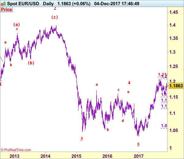 Euro’s long-term uptrend started from 0.8228 (26 Oct 2000) with an impulsive structure. The rise from 0.8228 to 0.9593 (5 Jan 2001) is labeled as wave I, the retreat to 0.8352 (6 Jul 2001) is wave II and the rally to 1.3670 (31 Dec 2004) is wave III. Wave IV from there ended at 1.1640 (15 Nov 2005), the subsequent upmove to 1.6040 (July 15, 2008) is treated as wave V, the major selloff from the record high of 1.6040 to 1.2329 (October 27, 2008) signals a reversal has taken place with (I) leg ended at 1.2329 and once (II) ended at 1.5145, wave (III) itself is an extended move with I: 1.1876 and complex wave II ended at 1.4902, wave III has commenced with wave 1 and 2 ended at 1.2042 and 1.3993 respectively, wave 3 of III is now unfolding for weakness towards parity.